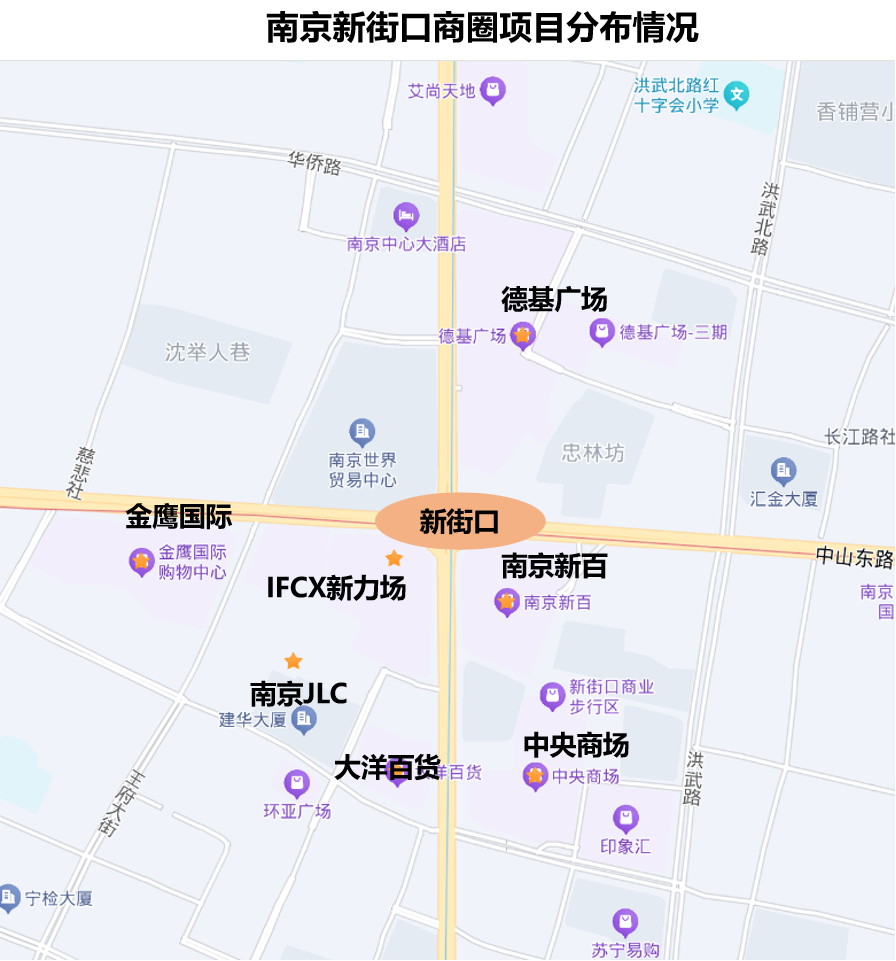 该商圈内分布着德基广场、中央商场、新百商场、金鹰国际购物中心、南京IFCX新力场等多个商业项目,其中不乏运营成熟、知名度高的传统百货和购物中心。
