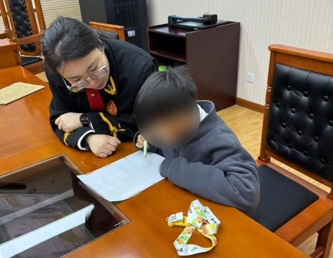 在一起抚养费纠纷案件中,针对涉案未成年人小宇处于上学阶段、课业紧张的情况,密云法院少年法庭刘珍君法官利用周末时间与小宇单独沟通。俯身坐在小宇身旁,轻声询问他的生活状况、学习情况以及对父母关系的感受。从起初紧张地攥着衣角到逐渐放松、露出腼腆的笑容,小宇在刘珍君的引导下,表达了自己的想法和感受,未成年人的诉讼参与权、表达权得到了保障,刘珍君也将小宇的心声转达给其父母。
