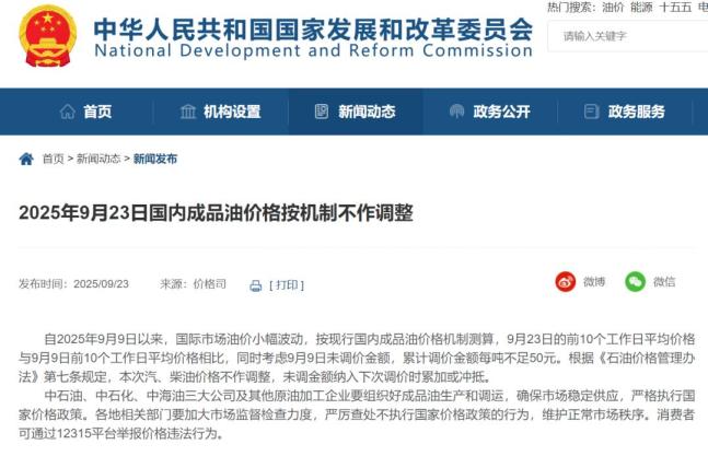 据国家发改委网站消息,自2025年9月9日起,国际市场油价有小幅波动。按照现行国内成品油价格机制来测算,9月23日前10个工作日的平均价格和9月9日前10个工作日平均价格相比,再加上考虑9月9日未调价的金额,累计调价金额每吨还不足50元。依据《石油价格管理办法》第七条规定,本次汽、柴油价格不做调整,未调整的金额会纳入下次调价时进行累加或者冲抵。