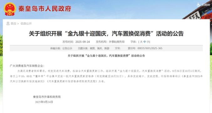2025年7月23日,秦皇岛市外事和商务局发布了关于调整2025年汽车置换更新政策具体实施办法的公告,其中提到,自2025年7月24日(含当日)起,该市汽车置换更新政策具体实施办法调整为“先领取资格、再申报补贴”的方式。