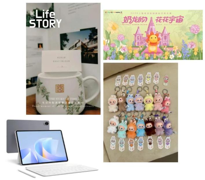 直播派送的福利有:浦江郊野公园门票、马桥文化展示馆文创盲盒、Costa联名定制杯、摩卡色珐琅锅、华为手表、耳机及神秘惊喜大礼。