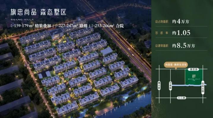 尚园位于上海三大别墅区之一的旗忠板块,容积率约为1.05,是一个包含186套可售住宅(精装叠墅、联排别墅、合院别墅)的低密社区,此次首开44套可售房源。