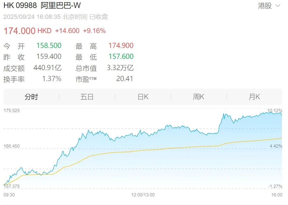 吴泳铭在云栖大会的表态,引发资本市场强烈反应。受此影响,阿里巴巴港股大涨超9%,收盘价每股174港元,创2021年10月以来新高;企业总市值达3.32万亿港元,一日增加近3000亿港元。