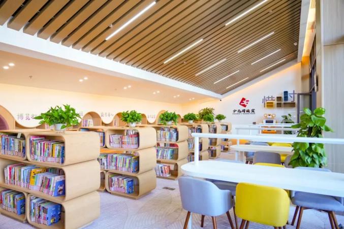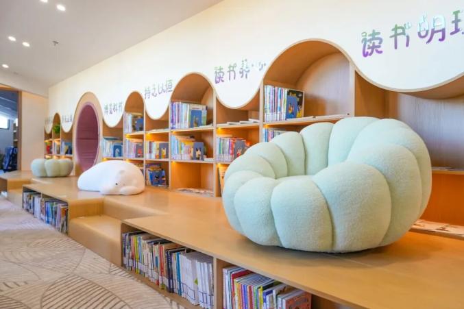 与成人阅览区相对的少儿馆充满童趣,整体用明亮活泼的暖色,书架高度、桌椅尺寸、阅读灯光等都根据儿童使用习惯设计。区域内还增加了各类趣味摆件,如丰富的墙面装饰、舒适可爱的靠垫和小狮子造型的自助借阅机,为孩子们打造了温馨快乐的阅读空间。