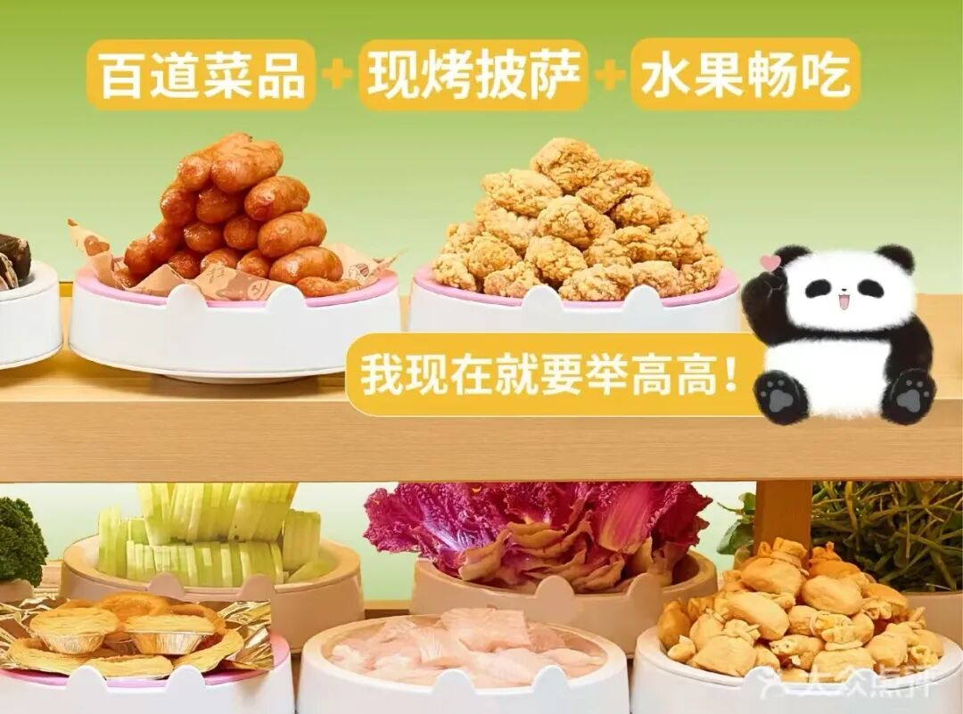 就餐服务方面,举高高有着和海底捞类似的细致服务,餐品区配备生熟食区分夹子、一次性围裙、头绳等贴心用品。门店装修以绿色为主色调,搭配熊猫IP形象,向消费者传达“绿色健康、自然好味”的品牌理念。
