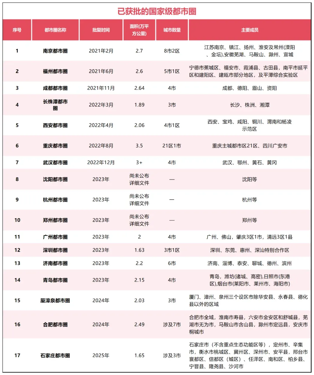 之后四年,长株潭、西安、重庆、武汉、沈阳、杭州、郑州、广州、深圳、青岛、济南、厦漳泉、合肥、石家庄都市圈获批。