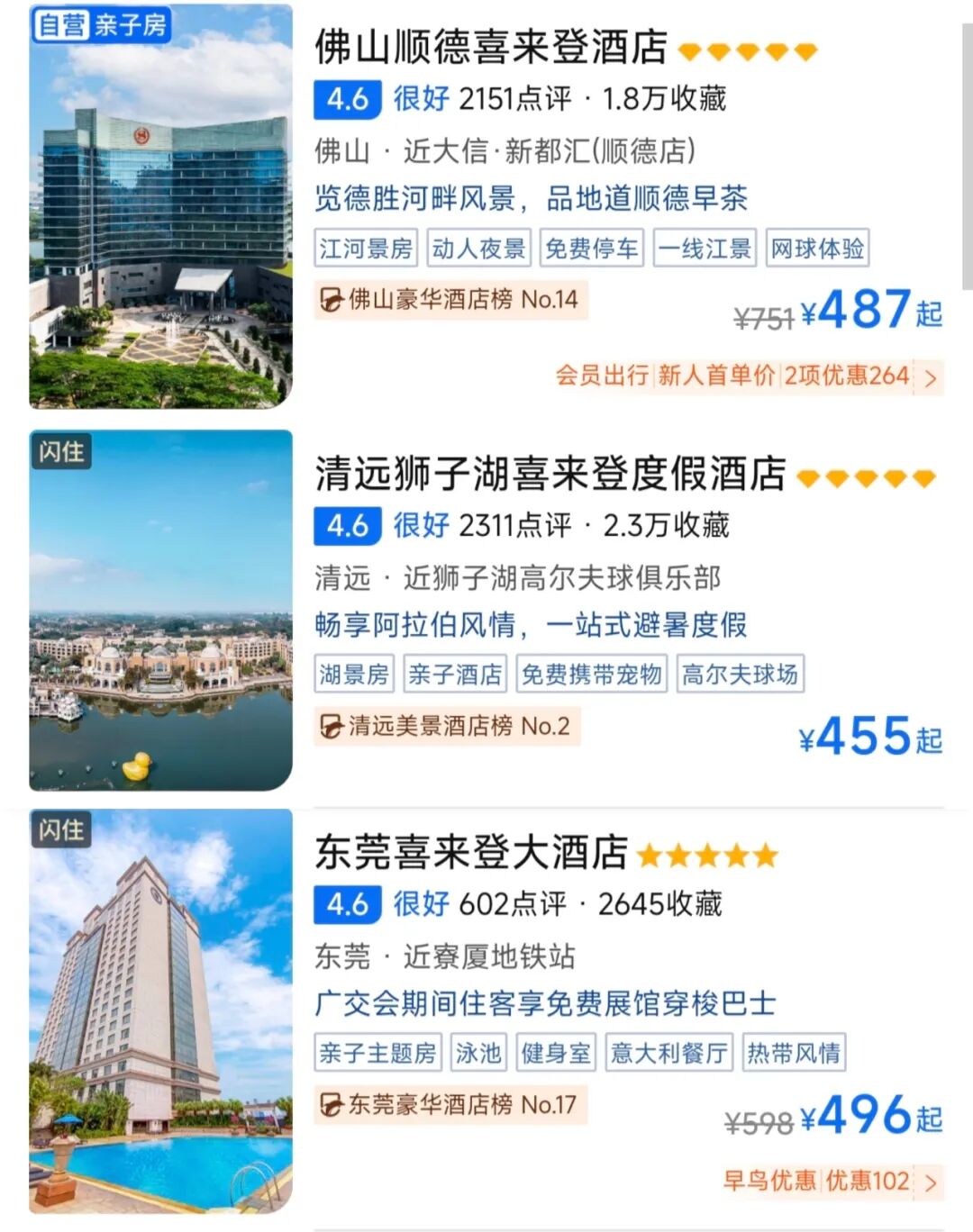 近期有网友发现,中山喜来登推出了三天两晚套餐,仅售699元,算下来一晚不到350元,比同城的亚朵酒店价格还低。不仅如此,佛山顺德喜来登487元起,惠州白鹭湖的喜来登449元起步,这样的价格放在几年前简直难以想象。