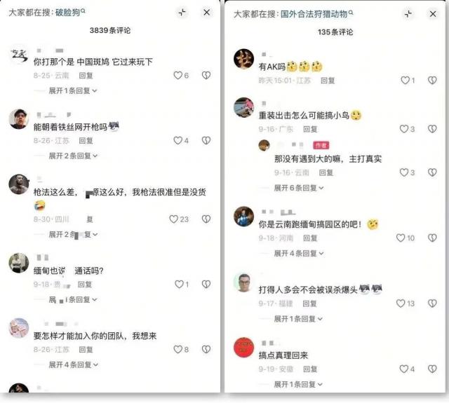 而且这些国外非法狩猎者在短视频平台有大量粉丝,评论区能看到一些“潜在狩猎者”,他们根据自身“狩猎经验”评判视频真实性,表达羡慕向往,甚至因嫉妒讥讽,但因种种“限制”无法行动(当然,评论区也有反对声讨留言)。可以预见,若任由违法信息传播,未来可能有更多“潜在狩猎者”付诸行动。