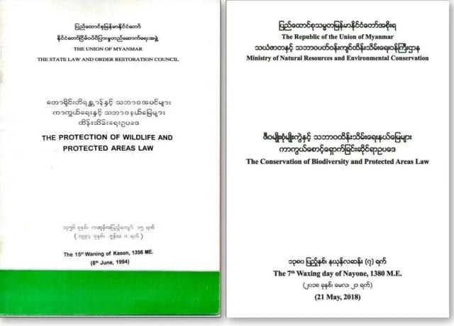 缅甸同中国一样,拥有成文的野生动物保护法。《野生动物与保护区保护法》早在1994年就已颁布,2018年又颁布了最新法规《生物多样性与保护区法》,取代陈旧保护政策,与《华盛顿公约》接轨,以应对本国严峻的非法野生动物贸易。