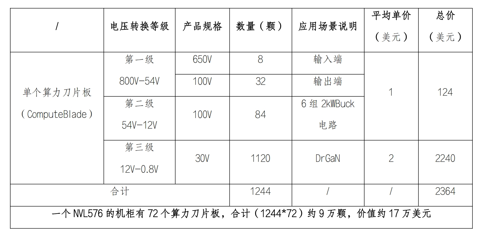 整柜72个算力刀片板约9万颗,再加服务器与NV Switch部分,总量接近10万颗,单柜GaN价值约18万美元。
