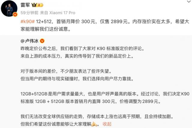 而且,这次内存涨价潮会从产业端蔓延至几乎所有消费级设备。前几天,雷军在微博回应红米K90定价高,原因就是“内存涨价太多”。