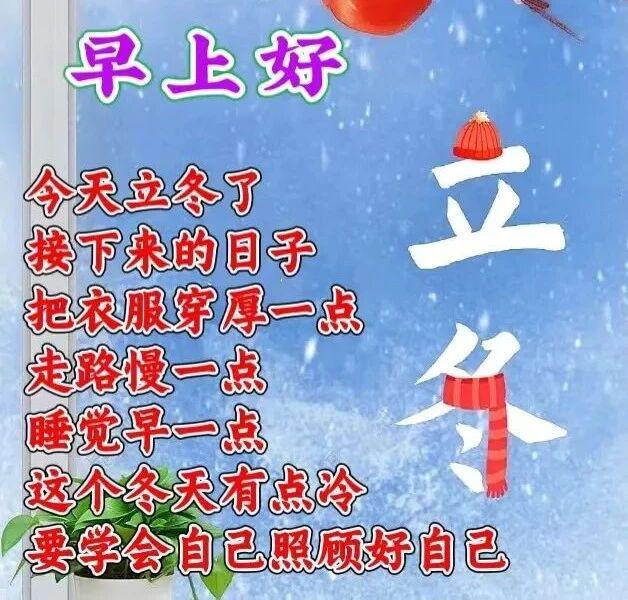 北风凛冽,冬天悄至。声声问候,句句祝福。朋友们,早上好!今日立冬,愿你心情美妙,健康围绕;平安好运常伴,幸福时刻笼罩。寒冷冬日,祝你安康如意!