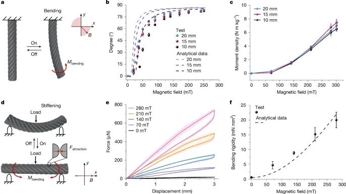 作者揭示了纱线在磁场中的两种主要工作模式:弯曲模式与硬化模式。当存在易轴与磁场方向的角偏差时,磁矩产生磁扭矩,引发弯曲力矩(Mbending),促使纱线对齐磁场或抵抗外力(图3a,d)。实验表明,不同长度的MR纱线在磁场下的弯曲角度与模型预测一致(图3b),其力矩密度随磁场增强而提高,最高达约7Nmkg⁻¹(300mT;图3c)。在三点弯曲测试中,纱线弯曲刚度随磁场从0mT增至280mT提高了约30倍,从0.68mNmm²升至20mNmm²(图3e,f)。该性能提升除磁扭矩作用外,还源于磁化纱线内部螺旋纤维间磁吸引力所导致的摩擦增强。