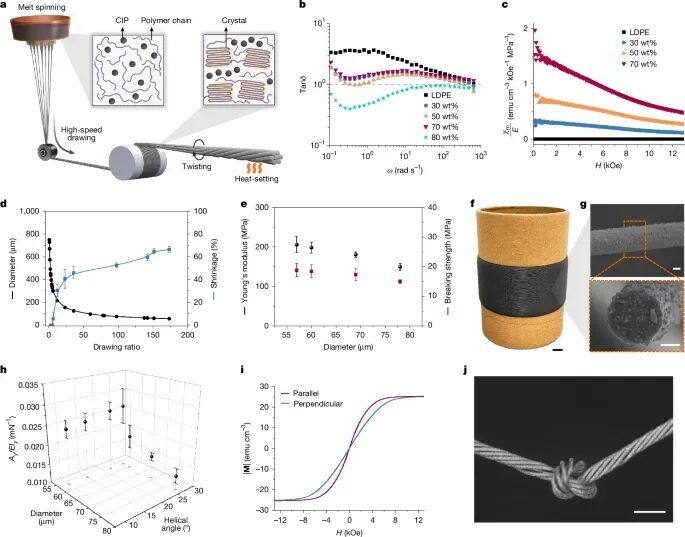 作者通过理性选择低密度聚乙烯作为聚合物基质,羰基铁粉作为磁性填料,利用双螺杆挤出机制备了填料分布均匀的复合材料。通过系统分析流变特性,确定了具有最高χₘ/E值(1.23emucm⁻³kOe⁻¹MPa⁻¹at3kOe)且可熔融纺丝的70wt%CIPs复合材料(图2c)。采用熔融纺丝与原位高速牵伸工艺,将纤维直径拉至57μm(图2d),同时提升了聚合物链取向性与CIP分布各向异性(图2a,d)。纱线由七根纤维捻合并经热定型制成,优化后的纱线具有高Ay/EIy(0.027mN⁻¹)和显著磁各向异性(轴向与径向磁化比1.4at3kOe;图2h,i),并展现出优异的柔韧性与耐久性(图2j)。