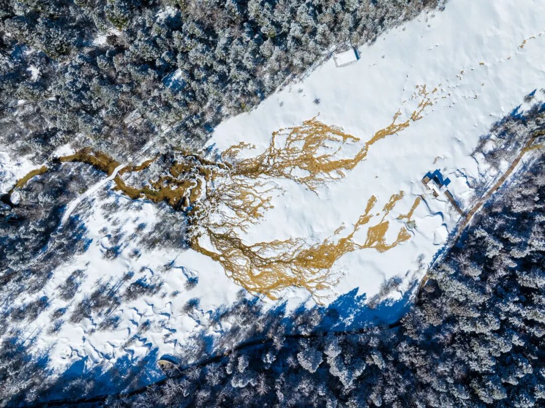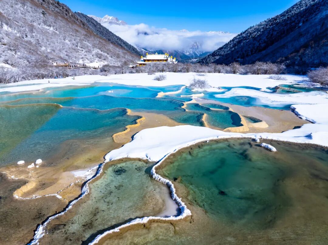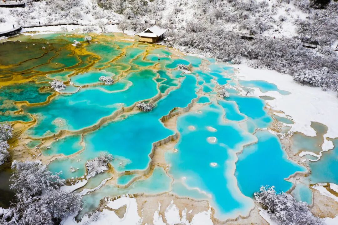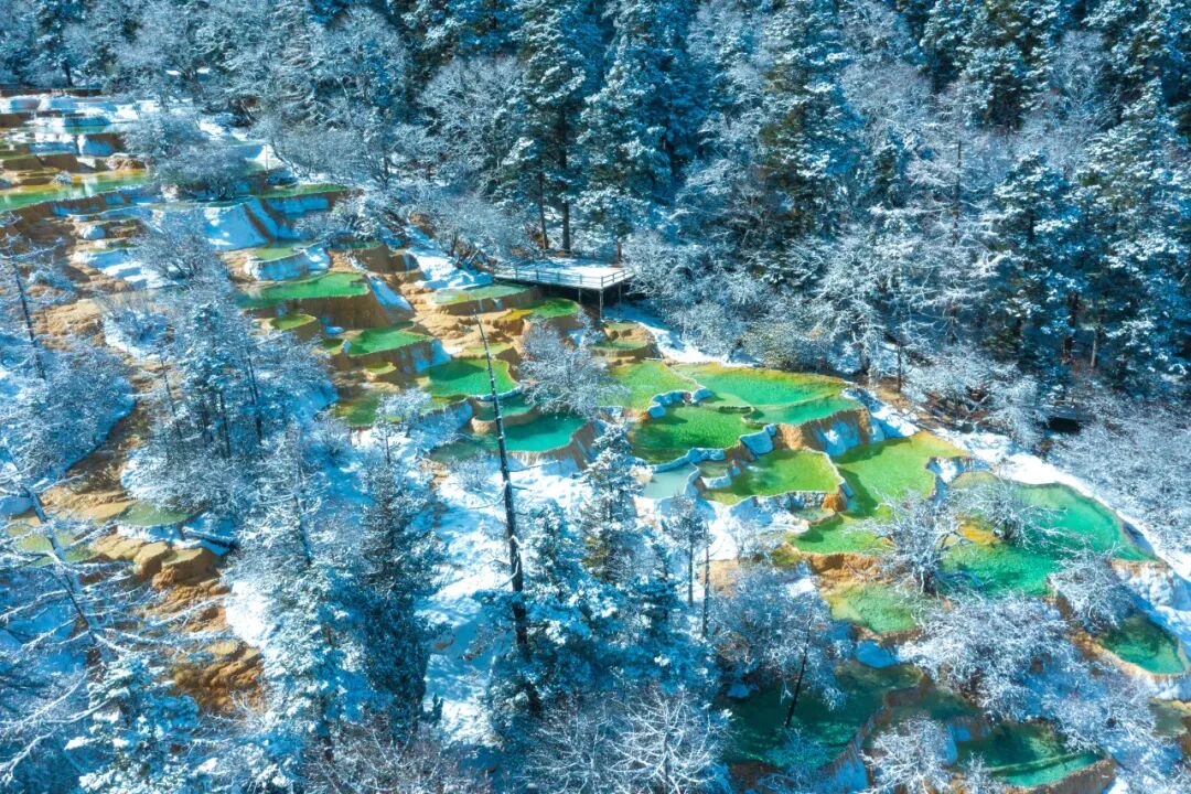 层层叠叠的钙华池在白雪的衬托下,呈现出更加鲜艳的蓝绿色,宛如镶嵌在山谷中的翡翠。