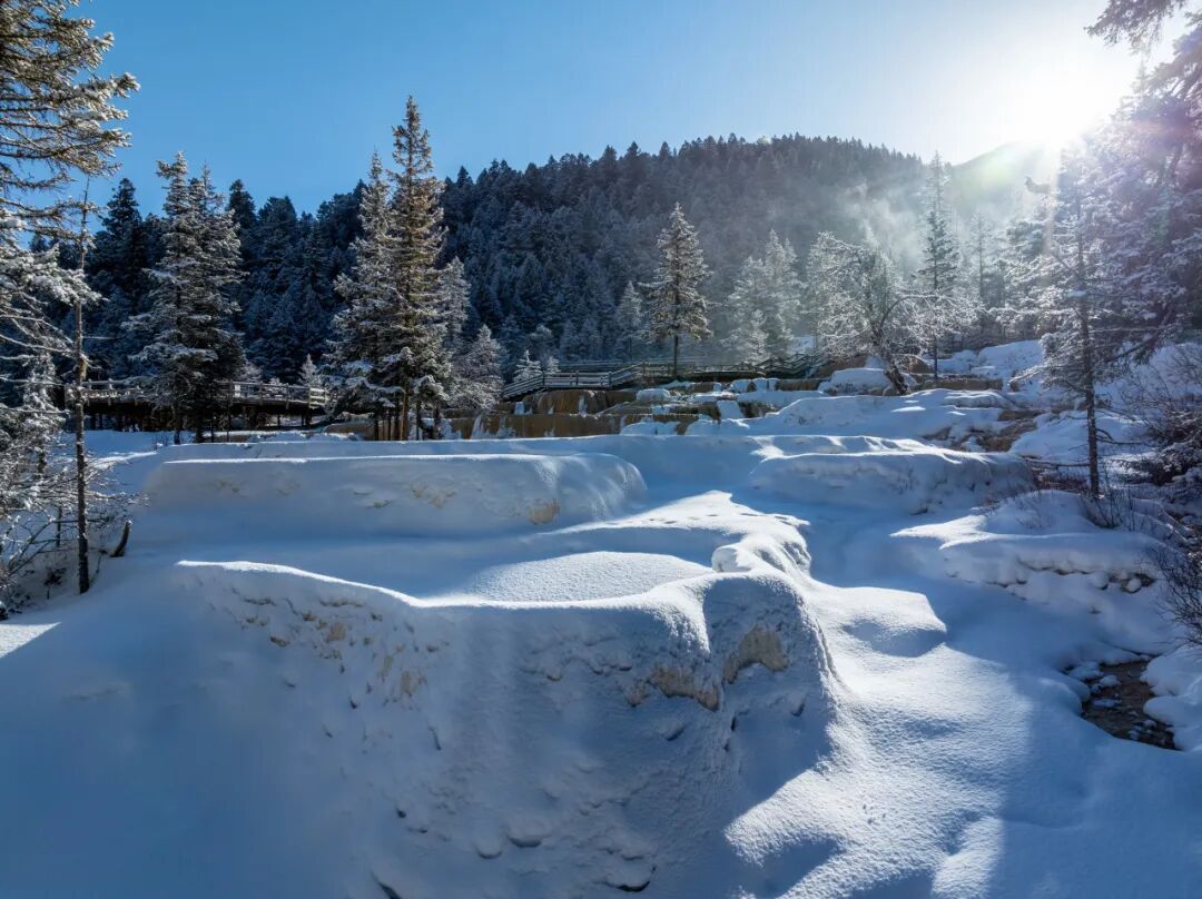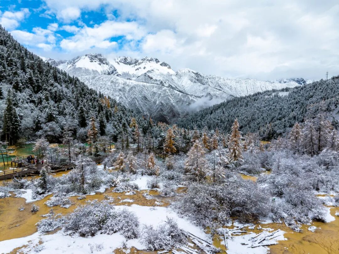 当城市的秋意还未消散,黄龙已被银装素裹。这不是普通的雪景,而是大自然精心打造的视觉盛宴: