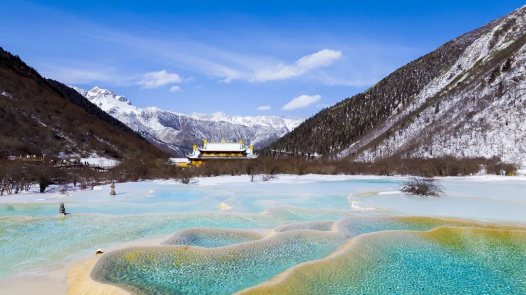 来黄龙,赏彩池披雪、瑶台生烟之景