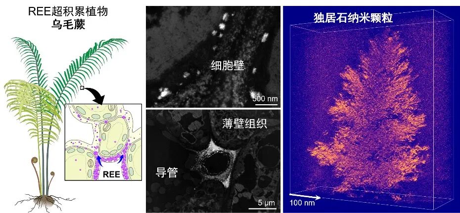 近日,中国科学家首次在“乌毛蕨”这种蕨类植物体内发现稀土成矿现象。这些稀土在植物组织细胞间“自我组装”,形成了“镧独居石”矿物。
