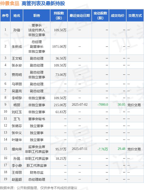 仲景食品的高管列表及最新持股情况如下: