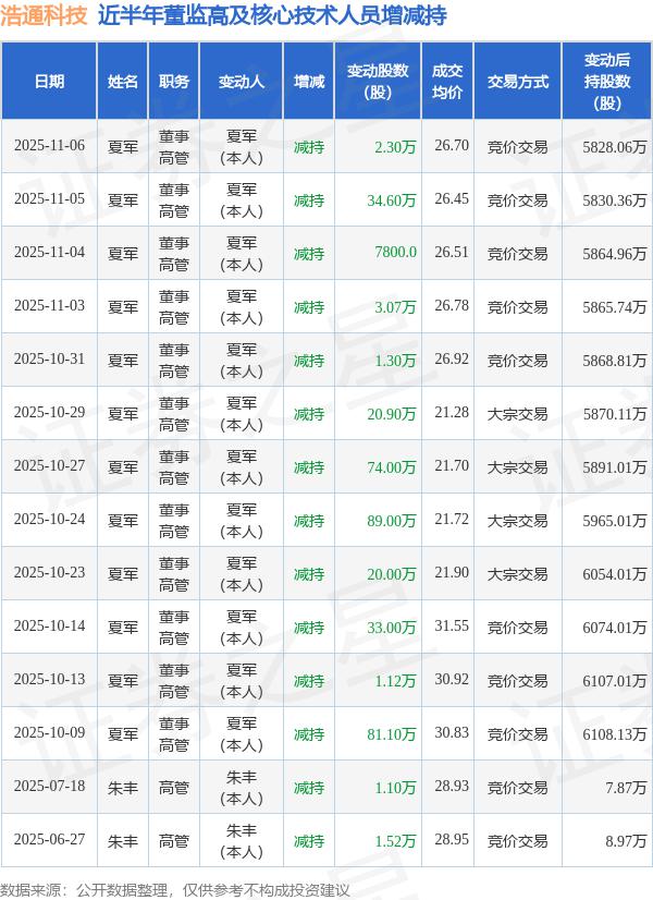浩通科技近半年内董监高及核心技术人员增减持详情如下:
