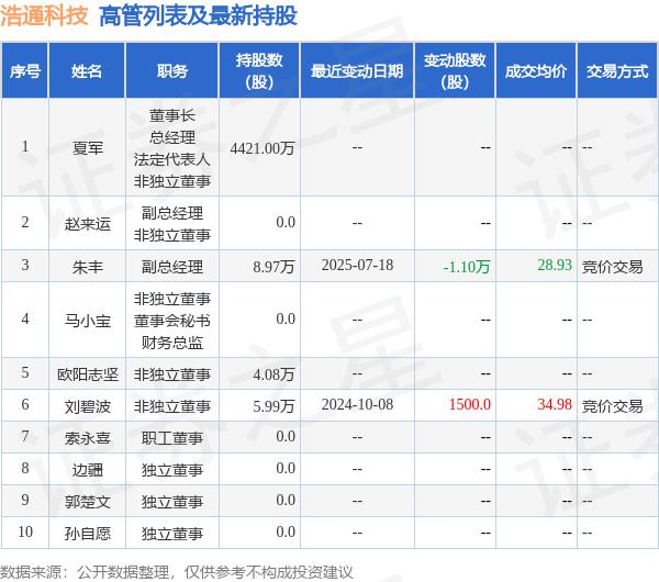 浩通科技的高管列表及最新持股情况如下: