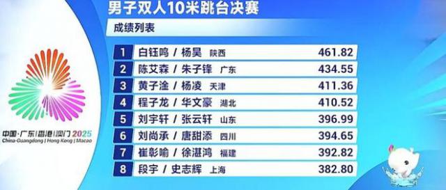 陕西队组合白钰鸣/杨昊以461.82分轻松夺冠,广东队选手陈艾森/朱子锋以434.55分获得银牌,天津队选手黄子淦/杨凌以411.36分获得铜牌。