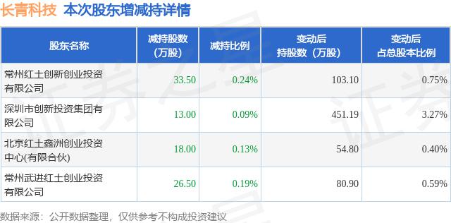 证券之星消息,11月7日,长青科技发布《长青科技 : 关于合计持股 5% 以上股东及其一致行动人权益变动触及 1% 整数倍暨权益变动至 5% 以下的公告》。公告显示,其股东常州红土创新创业投资有限公司、深圳市创新投资集团有限公司、北京红土鑫洲创业投资中心 ( 有限合伙 ) 、常州武进红土创业投资有限公司在2025年10月24日至2025年11月6日期间,合计减持91.0万股,占公司目前总股本的0.6594%。在变动期间,该股股价下跌0.94%,截至11月6日收盘,股价报19.96元。