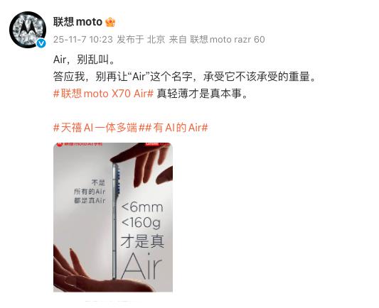 早上,联想直接高调宣传自己的产品联想moto X70 Air,并配文: