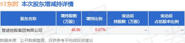 据证券之星消息,11月7日,ST东时发布了《ST东时 : 关于控股股东所持公司部分股份被司法拍卖完成过户暨权益变动的提示性公告》。公告显示,其股东登途控股集团有限公司在2025年5月8日至2025年5月13日期间,合计增持了48.9万股,占公司目前总股本的0.0684%。在变动期间,该股股价上涨了1.69%,截至5月13日收盘,股价报3.0元。