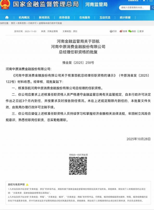 11月7日,国家金融监管总局河南监管局发布任职资格批复,核准邵航担任河南中原消费金融股份有限公司(以下简称“中原消费金融”)总经理,邵航正式成为该公司第二任总经理。