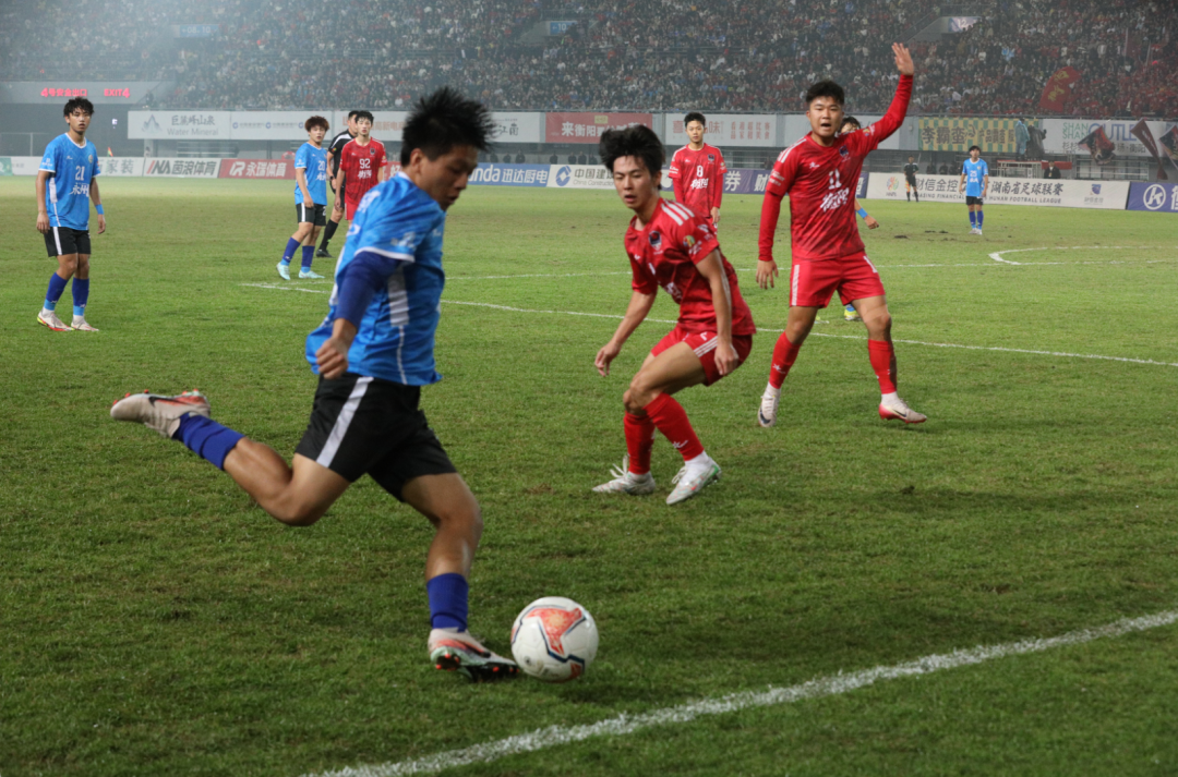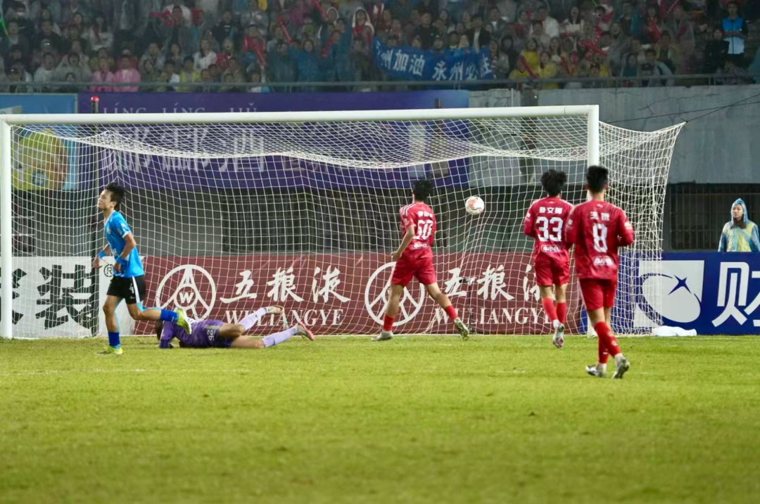 由于赛前降雨,比赛场地给双方球员的技术发挥带来了不小的挑战。不过,永州队迅速适应了场地条件。比赛进行到第15分钟时,永州队47号队员林昊推射破门,率先得分,比分变为1:0,永州队取得领先。这粒进球展现了永州队流畅的进攻配合,远征客场的永州球迷们也因此热情高涨。看台上,蓝色旗帜随风飘扬,“永州队,加油”的呐喊声连绵不断,成为球队最坚强的后盾。