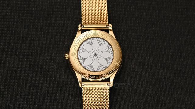 背面是密底抛光镜面设计,装饰有品牌标志性的“Her Time”花纹图案。碟飞系列的密底设计主要是为保持表背平整和佩戴舒适,也让整表视觉重心集中在正面细节上。