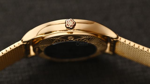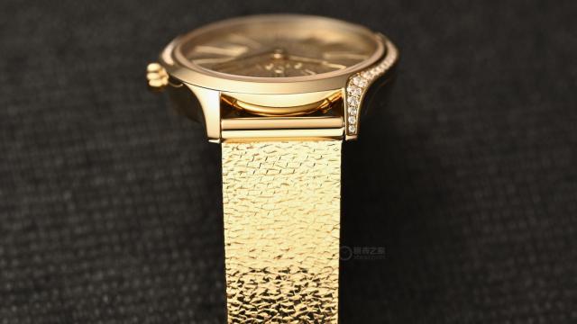 整只表呈现出温暖不刺眼的金色,很好地衬托出碟飞系列女性化的线条。表壳两侧镶嵌38颗全切割钻石,十分华丽,钻石从表盘延伸至表耳,线条优美,不死板。表冠很独特,是一朵小红花,也是碟飞系列的标志,花朵图案由红色液态陶瓷打造,花蕊处镶嵌一颗钻石,更凸显整体高贵气质。
