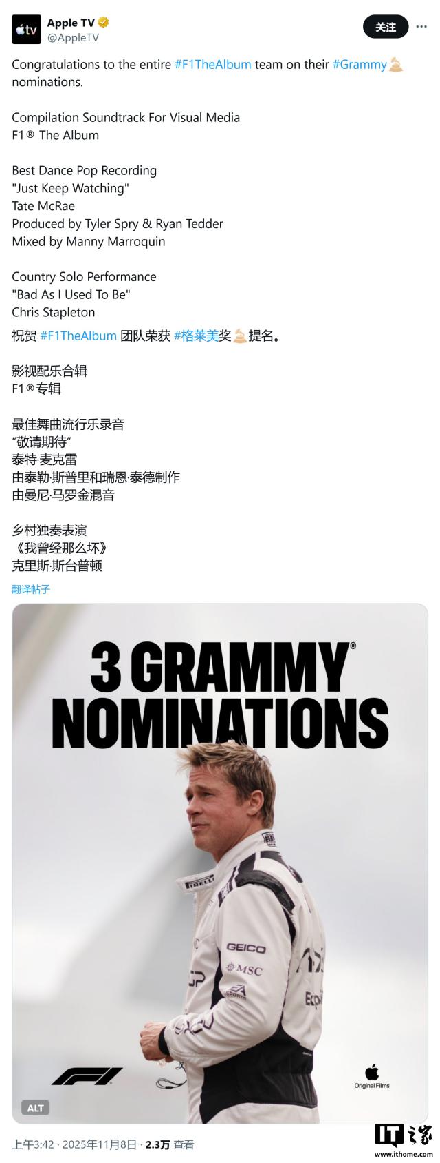 苹果原创内容再展实力:《F1:狂飙飞车》《人生切割术》入围格莱美