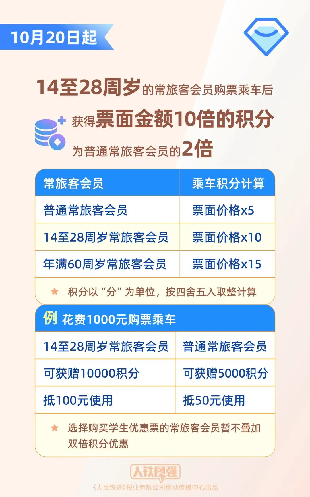 10月20日起,铁路部门优化升级了“铁路畅行”常旅客会员服务。14至28周岁的常旅客会员购票乘车后将获得票面金额10倍的积分,为普通常旅客会员的两倍。