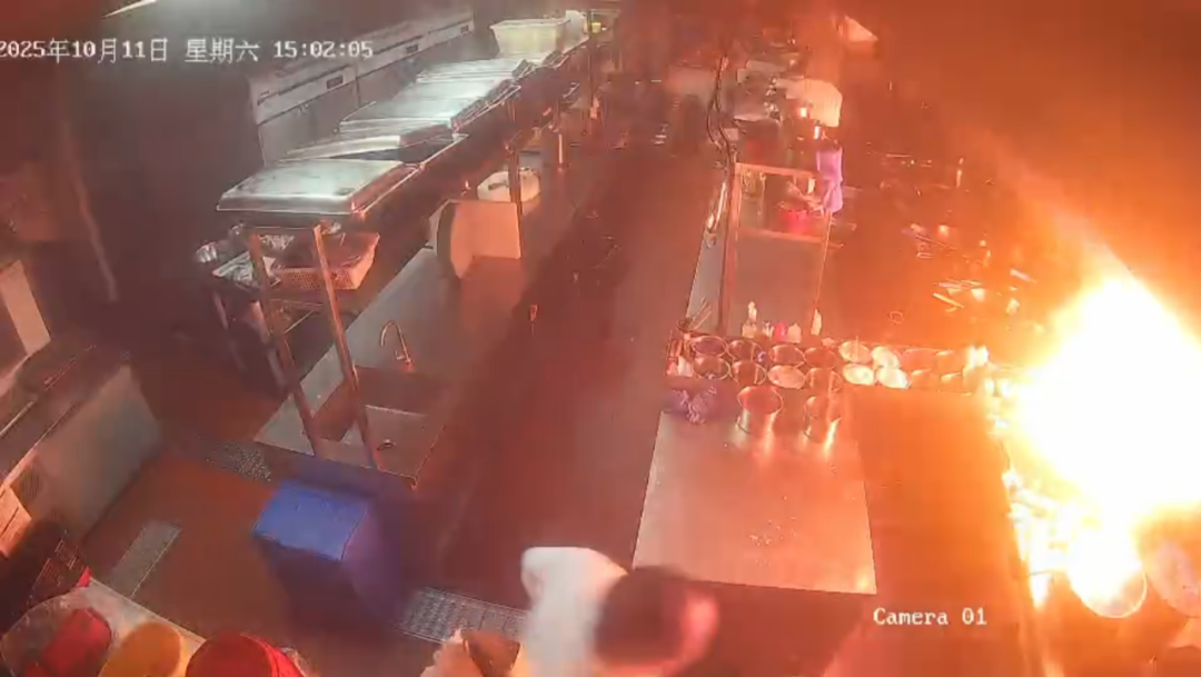 现场监控显示,厨师张某起油锅后就离开了,锅内油温过高起火,直到火势猛烈燃烧起来,张某才发现。