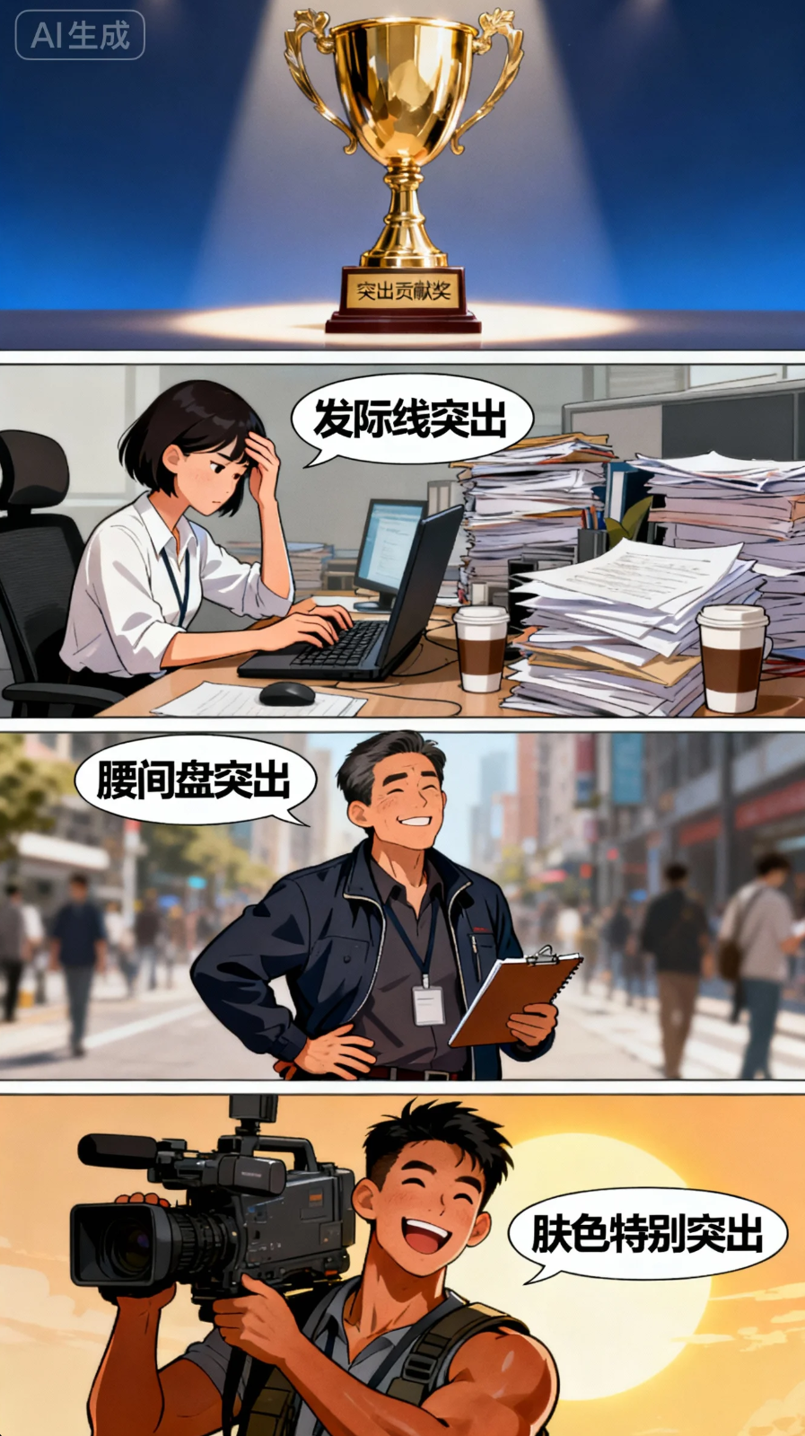 常听人说,做人不要太突出,但咱们做新闻的,不得不突出!采访编辑组——发际线突出,每篇10万+背后,都有一个日渐光亮的额头;摄像团队——腰间盘突出,从摇臂到地面,我们用腰椎书写镜头语言;摄影天团——肤色突出,左脸高原红,右脸黢黑,这是属于我们职业的限定妆容。