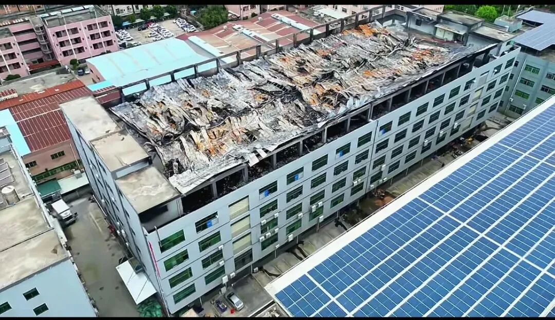 经过消防救援人员的紧急处置,现场明火被及时扑灭,事故未造成人员伤亡。据初步统计,过火面积约500平方米,燃烧物质为音响包装材料等物品,厂房顶层周围烧毁严重。目前,起火原因仍在进一步调查中。