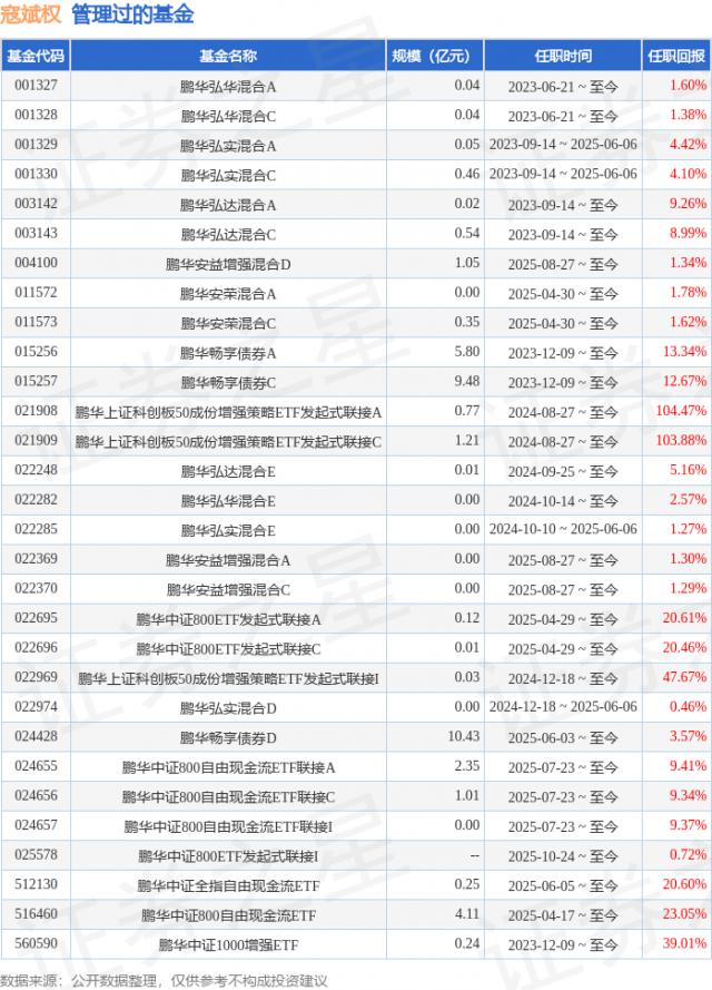 寇斌权先生是中国国籍,拥有物理学博士学位。2018年7月,他加盟鹏华基金管理有限公司,曾在量化及衍生品投资部担任大数据分析研究助理、量化研究员、高级量化研究员、资深量化研究员等职,现在担任指数与量化投资部基金经理。他在2023年6月开始担任鹏华弘华混合基金经理,同年9月担任鹏华弘达混合基金经理,2023年9月至2025年6月担任鹏华弘实混合基金经理,2023年12月担任1000ETF增强基金经理和鹏华畅享债券基金经理,2024年8月担任鹏华上证科创板50成份增强策略ETF发起式联接基金经理,2025年4月担任鹏华中证800自由现金流ETF基金经理、鹏华中证800ETF发起式联接基金经理和鹏华安荣混合基金经理,2025年6月担任鹏华中证全指自由现金流ETF基金经理,2025年7月担任鹏华中证800自由现金流ETF联接基金经理,2025年8月27日担任鹏华安益增强混合型证券投资基金基金经理。