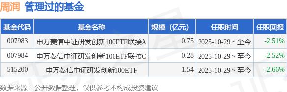 周润先生拥有中国国籍,是硕士研究生学历。他从2015年开始从事金融相关工作,在2015年8月加入了申万菱信基金管理有限公司。他曾在数量研究岗任职,现在担任基金经理,同时还兼任投资经理。在2025年10月29日,他开始担任申万菱信中证研发创新100交易型开放式指数证券投资基金联接基金、申万菱信中证研发创新100交易型开放式指数证券投资基金的基金经理。