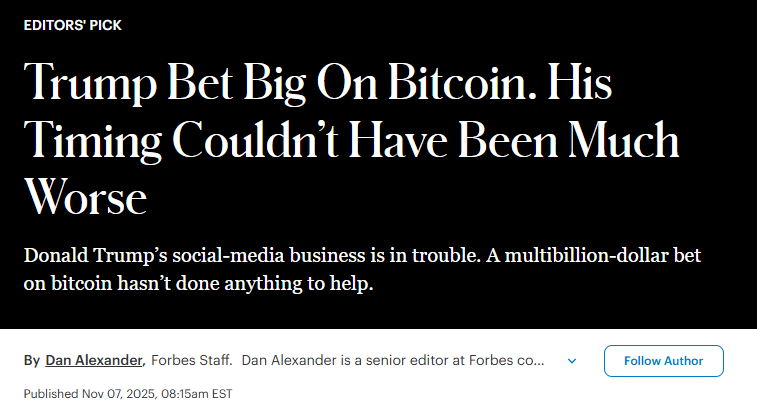 特朗普传媒发言人近日再度抨击媒体报道“失实”,声称:“只有像《福布斯》这样的假新闻媒体,才会将我们从上市时的2.74亿美元资产增长到最新财报披露的30亿美元,却说我们的比特币策略失败。”