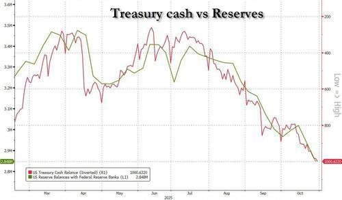 流动性紧张的根本原因,在于美国财政部一般账户(TGA)余额在过去三个月急剧膨胀。为应对政府关门,财政部从市场抽走了超过7000亿美元的现金,使其TGA余额自7月以来从约3000亿美元飙升至突破1万亿美元。
