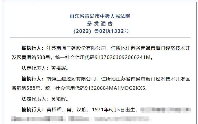 10月11日,青岛中院发布针对南通三建、三建控股、黄裕辉等多人的悬赏通告,有效期至2026年10月10日。