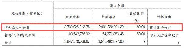 其中,恒大系应收账款37.39亿,计提坏账准备29.91亿元,计提比例80%。