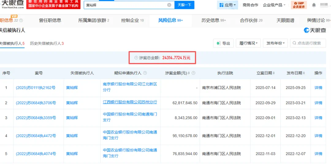天眼查数据显示,截至目前,黄裕辉有5条失信被执行人记录,涉案总金额2.43亿元。