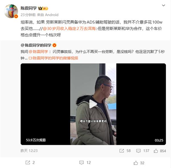 陈震直白地表示:“坦白讲,如果劳斯莱斯闪灵配备了华为ADS辅助驾驶,我不介意多花100万去购买它……”