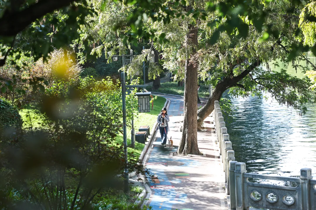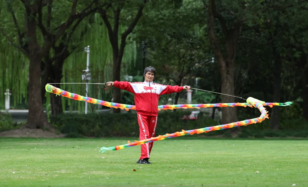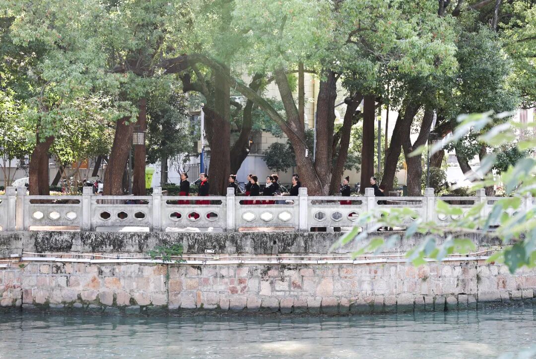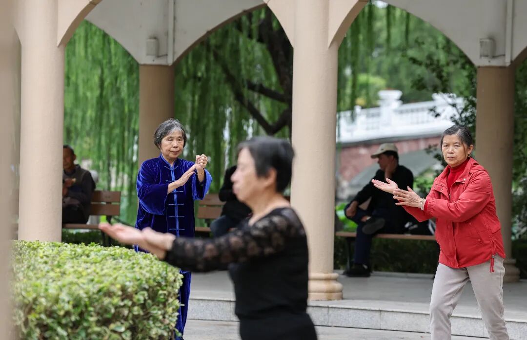 看呐,在思贤公园荷花池旁的凉亭下,几位老人正伴着音乐打起了太极。他们的招式舒展而圆活,一会儿缓缓推掌,一会儿轻轻提步,尽显悠然之态。不远处的空地上,一支健身队活力四射,舞着彩带龙、抖着空竹,场面十分热闹。