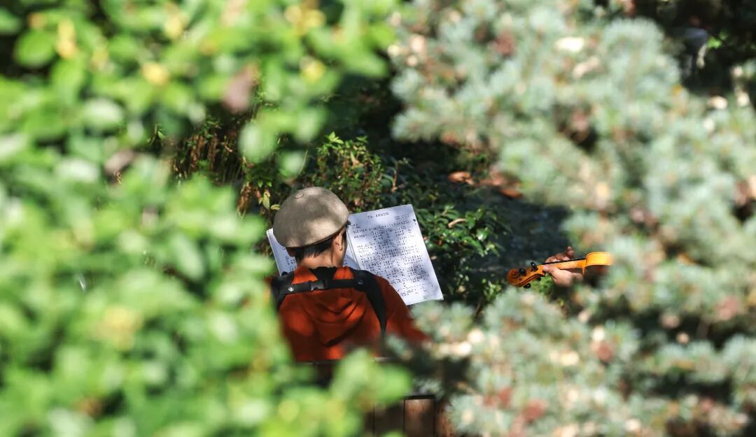 和大公园的开阔不同,街心花园宛如城市里的“惊喜小角落”。在岳阳街道老水厂街心花园,一支由四人组成的“临时乐队”正在演奏音乐。西洋乐器与中式民乐相互交融,碰撞出独特的韵律,引得路过的市民纷纷驻足聆听。