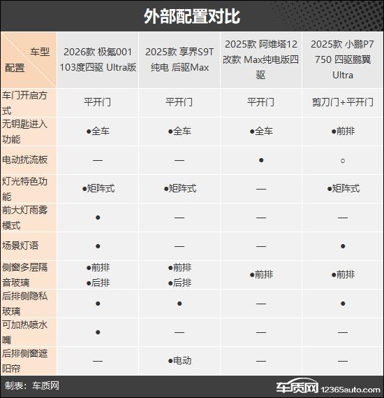 外部配置方面,阿维塔 12 表现相对保守,很多功能未配备,但标配的电动扰流板凸显其独特个性。小鹏 P7 以剪刀门 + 平开门组合设计成为视觉焦点,运动气质鲜明。极氪 001 的外部配置最全面,是四车中唯一配备可加热喷水嘴的车型,为冬季行车安全提供更可靠保障。