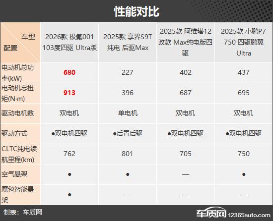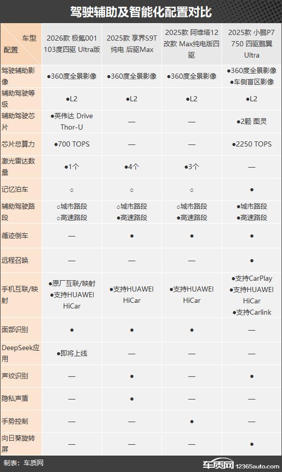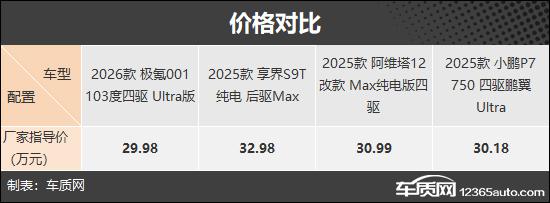 本次推荐的四款车型为极氪 001、享界 S9T、阿维塔 12 以及小鹏 P7。享界 S9T 售价略高,但整体与其他三款车型处于相近区间。它们中有的是全新车型,有的经历了换代或改款,代表了当前该级别车型的最新产品力水平(由于目前图片数量较少,部分车型的图片并非对应具体款型)。